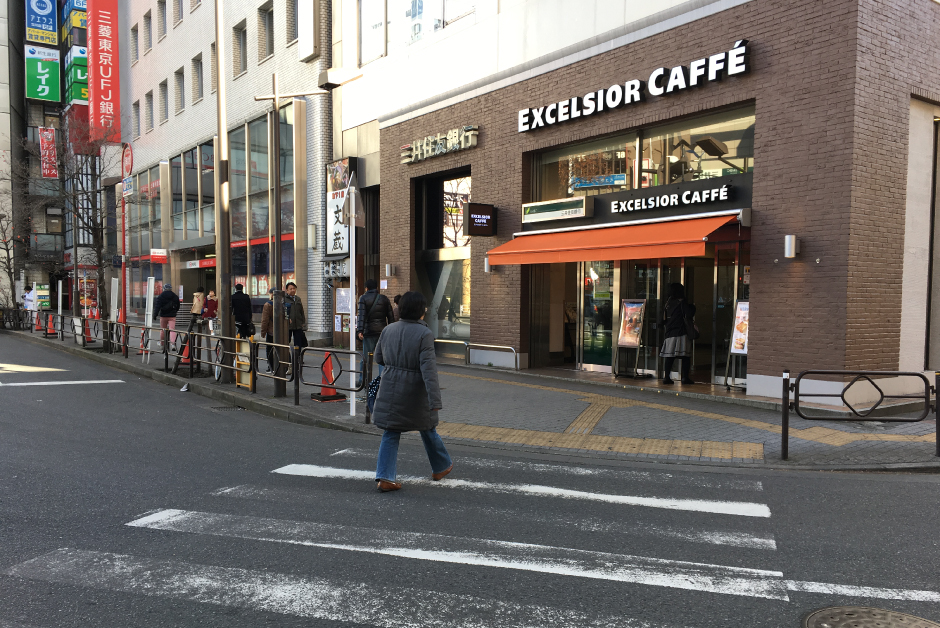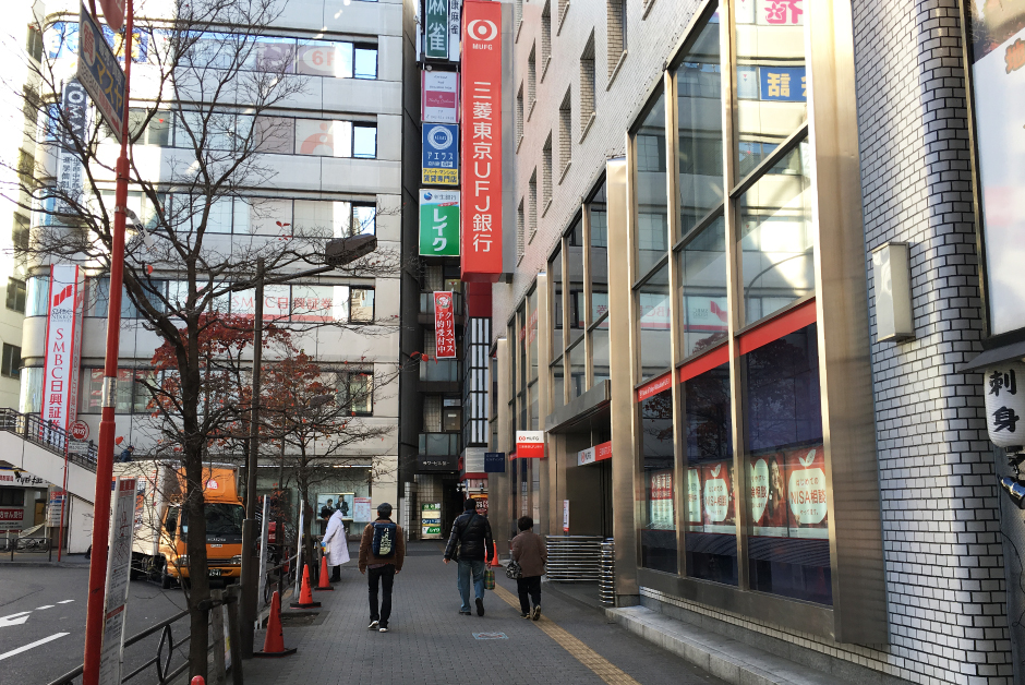 横断歩道を渡り、左手の三菱東京UFJ銀行の方へと進みます。