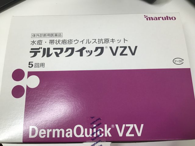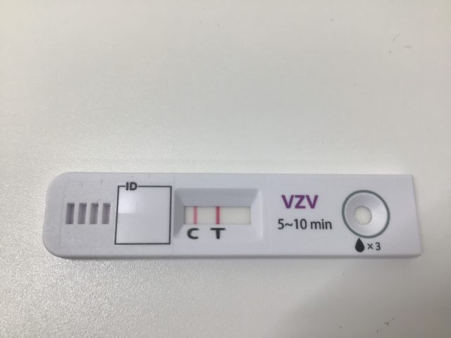 よく観察すると、赤い発疹の中に小さな水疱が見られ、左肩に痛みもあるとのことから、帯状疱疹の初期と考えられましたが、当院には「デルマクイック」という帯状疱疹の検査キットがあるため使用させていただきました。