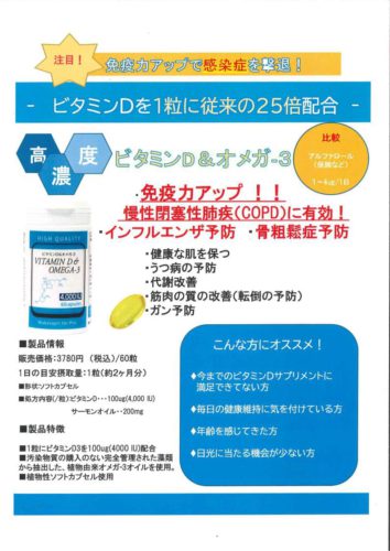 そんな方には「ビタミンD&オメガ-3」のサプリメントがオススメです。健康維持のサポートとして、是非取り入れてみてはいかがでしょうか。