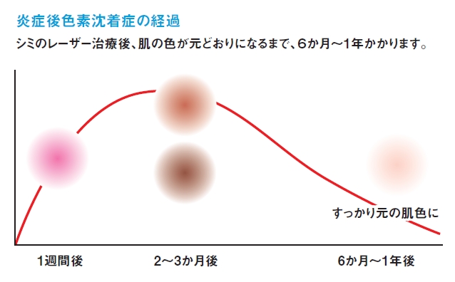 レーザー照射後は、炎症反応により一時的に色素沈着を起こします。個人差がありますが、これは約6ヶ月〜1年程でおさまります。その間、処方された美白外用剤を毎日使用してください。