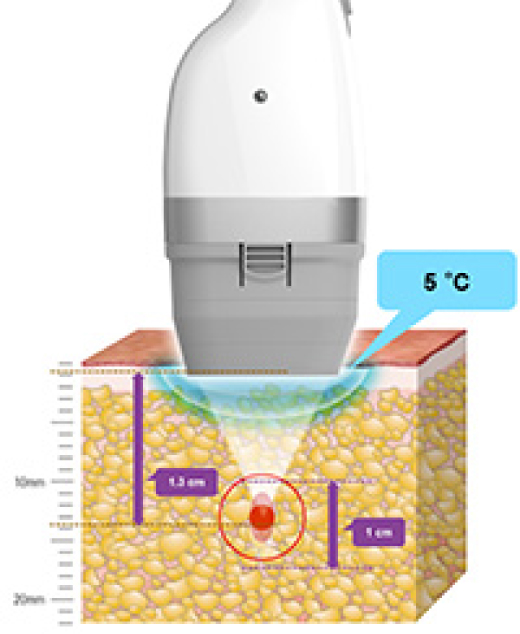 超音波を照射した脂肪層は温度が上がりますが、リポセルのヘッド部分は常に5℃まで冷却されています。