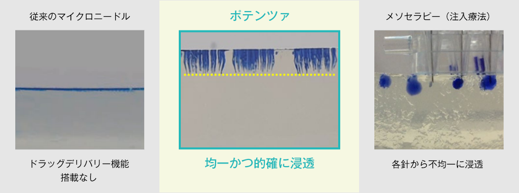 針によってできた穴に注入された薬剤はその空気圧によって押し込まれ、「真皮層まで均一に薬剤を浸透させます。