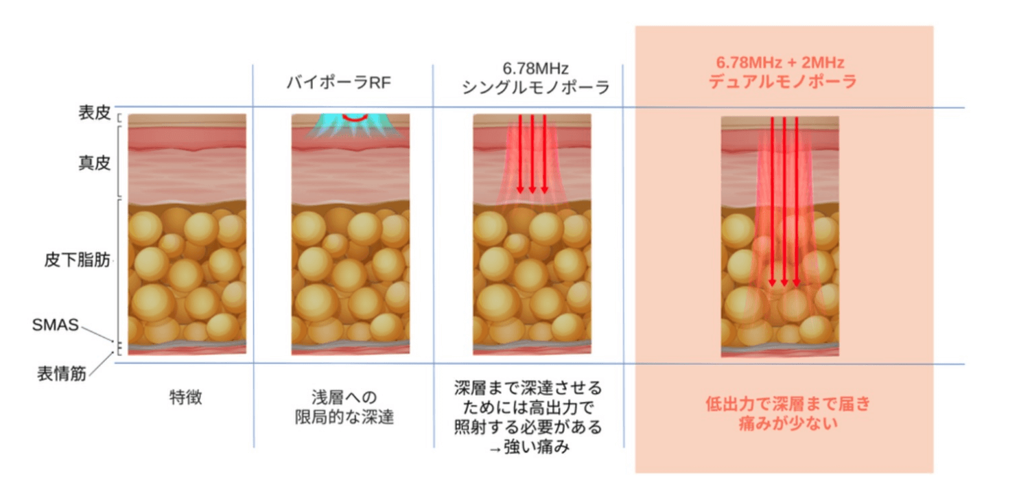 従来の高周波治療は6.78MHzが中心でしたが、ザーフではそこに2MHzを加えることで、脂肪層まで効率的に熱を届けられるようになりました。これにより、肌の奥からの引き締めと、真皮の再生によるハリや若々しさの回復を同時に期待できます。