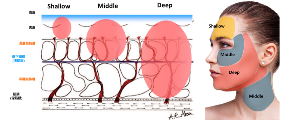 ザーフのDeepモードは、皮下組織の線維性隔壁と脂肪層にしっかりアプローチ。たるんだ輪郭を引き締め、シャープなVラインを目指したい方や、加齢によるフェイスラインの崩れが気になる方におすすめです。