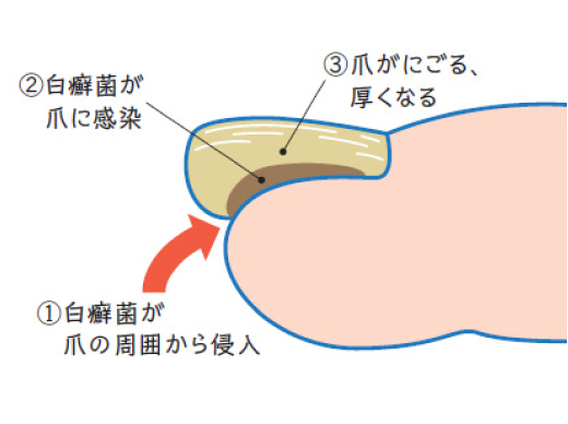 爪の中に白癬菌が入り込むと、爪白癬(爪水虫)となります。