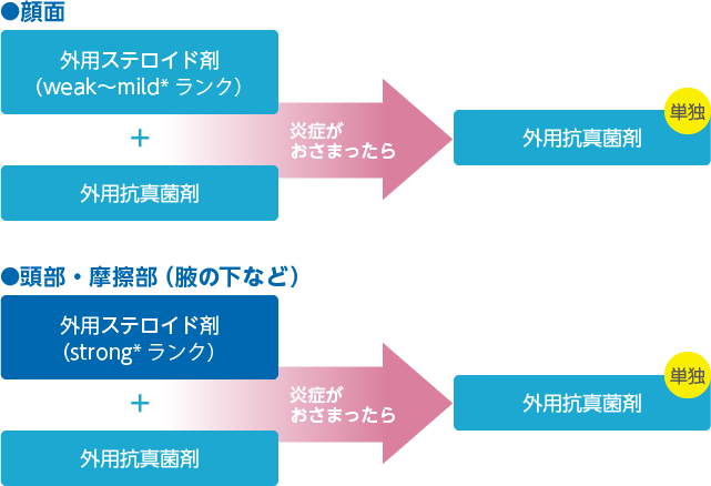 外用薬は病変部を石けんなどで洗い、清潔にしてから外用薬を塗布します。炎症がある場合は外用ステロイド剤、あるいは外用非ステロイド剤を使い分けながら使用し、真菌に対して外用抗真菌剤を使用します。