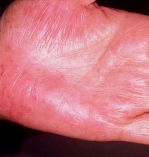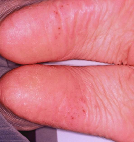 ⼿のひらや⾜の裏にぽつぽつと膿疱(のうほう・膿みをもった水疱)ができます。